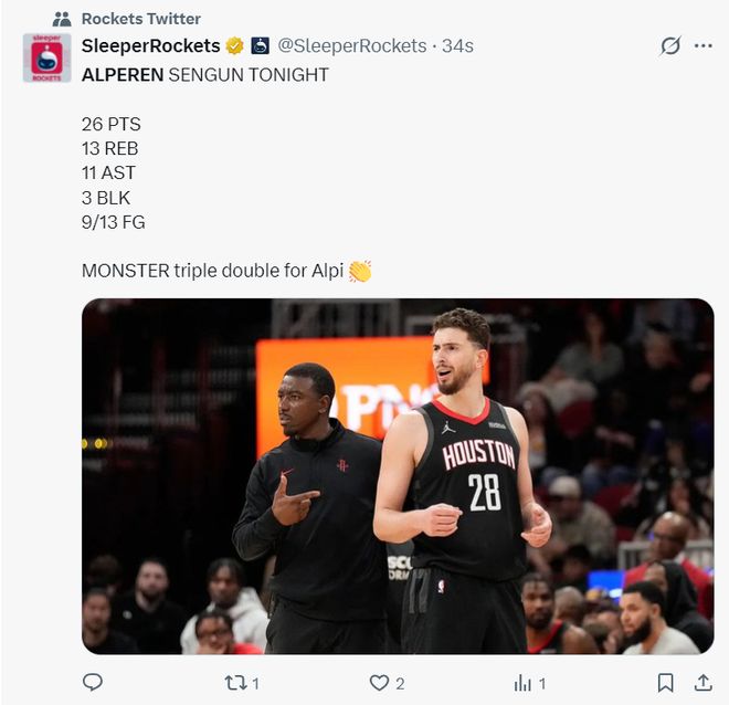 此役阿尔佩伦-申京表现非常出色,首节9分钟里他就已经3中3拿到6分4篮板4助攻,次节9分钟里更是6中3+三分1中1拿到12分5篮板3助攻,半场18分9篮板7助攻1抢断1盖帽1失误,真实命中率77.3%,正负值+24。国王的内线群根本无法限制他分毫。