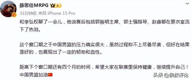 薛思佳写道:“和李弘权聊了一会儿,他说赛后包括郭振明主席、郭士强指导、赵睿都在更衣室流下了热泪。”
