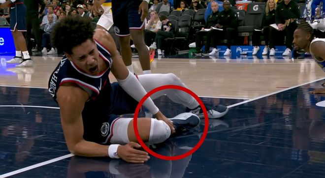 本场比赛,快船替补中锋在第二节遭遇了伤病,当时步行者的进攻回合,内史密斯突破上篮被尼德豪泽大帽扇掉,但是在落地时,尼德豪泽扭到了右脚,当时他就疼得一直拍地板。