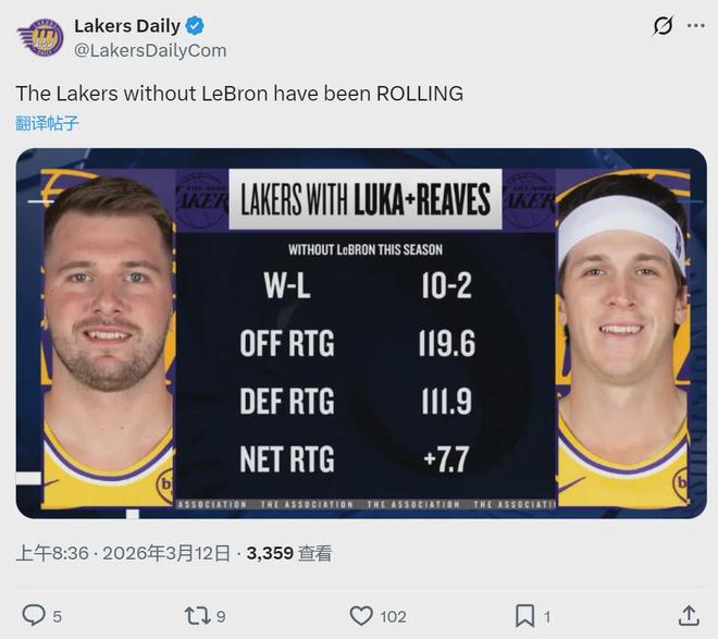 Lakers Daily今天又晒出一组数据:本赛季当詹姆斯缺席,东契奇和里夫斯同时出战,湖人10胜2负,胜率高达83.3%。这12场比赛,湖人进攻效率119.6,高居联盟第三;防守效率111.9,联盟第六;净效率+7.7,同样是联盟第三。
