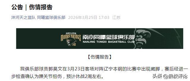 北京时间3月25日,根据南京同曦官方社媒公示,我俱乐部球员郭昊文在3月23日客场对阵辽宁本钢的比赛中出现崴脚,赛后经进一步检查确认为踝关节扭伤,预计休战2周左右。衷心感谢大家对郭昊文及南京天之蓝队的关心与支持。