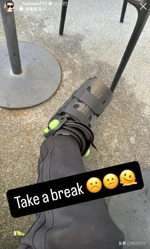 同曦官宣郭昊文伤情:踝关节扭伤预计缺席两周 已穿上保护靴