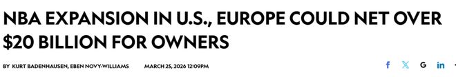 保守估算,这两项举措或将为现有NBA球队老板创造总计200亿美元的收益——其中两支美国本土球队的扩张加盟费约150亿美元,欧洲联赛加盟费约50亿美元。