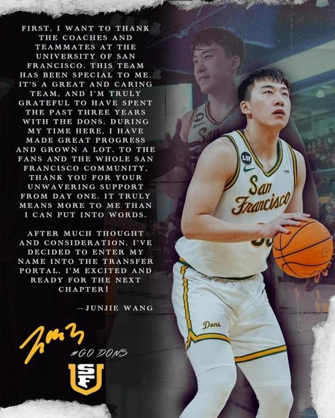 正是基于如此因素,如今王俊杰通过社媒感谢了旧金山大学:“首先,我想感谢旧金山大学的教练和队友。这支球队对我而言意义非凡,这是一个充满关怀的伟大团队。我非常感激过去3年,能够与球队共度时光。在这里的日子,我取得很大进步,也成长许多。对于球迷和整个旧金山社区,从第一天起你们就给予我坚定不移的支持,这对我而言意义重大,难以言表。”