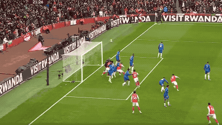 第45分钟,切尔西获得角球,拉亚被人群挤压的情况下,反身完成扑救。这一次防守过程中,赖斯抱人+手肘触球,切尔西球员投诉,裁判没有任何表示。