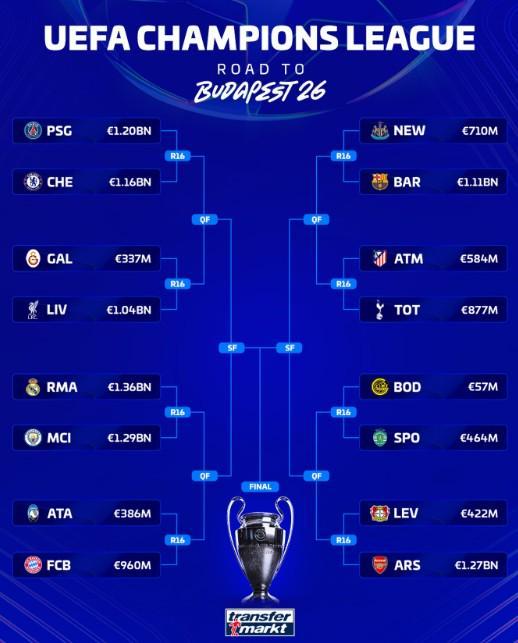 德转列欧冠16强对阵身价:阿森纳与勒沃库森相差8.5亿欧