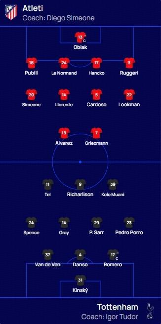 马竞vs热刺:格列兹曼、阿尔瓦雷斯首发,里沙利松、特尔出战