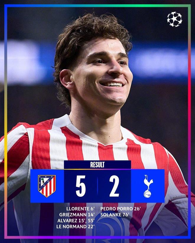 此役主场对阵热刺,马德里竞技凭借阿尔瓦雷斯上演梅开二度以及格列兹曼、马科斯-略伦特和勒诺尔芒各入一球,以5-2的比分击败对手。
