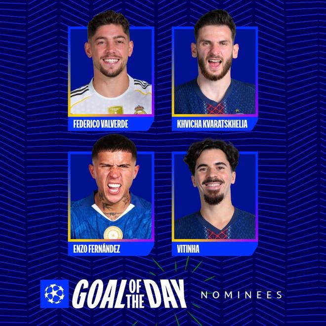 北京时间3月12日,在欧冠1/8决赛首回合第二比赛日的四场比赛结束后,欧冠官方列出了今日比赛最佳进球的四个候选者,巴尔韦德、恩佐-费尔南德斯、维蒂尼亚以及克瓦拉茨赫利亚的进球分别入选。