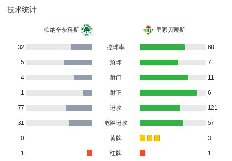 北京时间3月13日欧足联欧洲联赛 1/8决赛首回合,帕纳辛奈科斯对阵皇家贝蒂斯。下半场扎鲁里两黄一红被罚离场,希维德尔斯造点,塔沃尔达点射打入制胜球,迭戈-略伦特两黄一红被罚离场。最终比分帕纳辛奈科斯 1-0 皇家贝蒂斯。