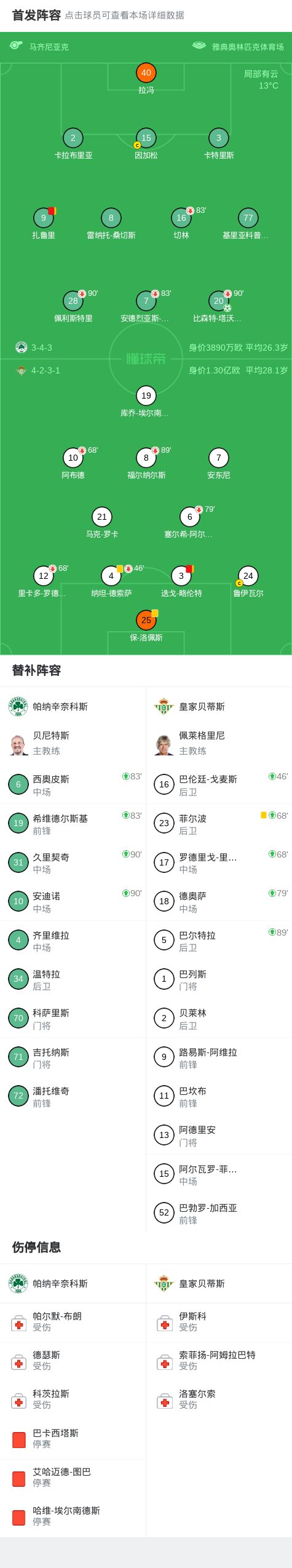 半场:帕纳辛奈科斯0-0贝蒂斯,阿维拉头球造险