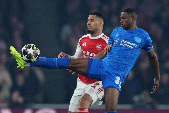 比赛开始不久,加布里埃尔抢点,肩膀击中皮球,出了底线。第15分钟,特罗萨德在禁区线上的一脚射门被扑了出去。6分钟后,加布里埃尔门前头球攻门,顶高了。随后,赖斯任意球直接射门,被扑了出去。第26分钟,格里马尔多在禁区左侧的射门被封堵。第36分钟,阿森纳进球了!埃泽在禁区外转身爆射,皮球像一颗炮弹一样钻入球门!半场结束,阿森纳1-0领先勒沃库森。