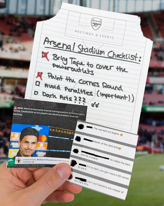 在“黑暗艺术”下,还附上了一则“洋葱新闻”,内容是阿尔特塔希望阿森纳在全黑环境中进行训练,以便他的球员能够发展出捕食者级别的球感追踪能力。然后就是“评论区”,阿森纳球迷在热烈讨论:“真正的黑暗艺术开始了”、“黑暗艺术大师”、“艺术自有其理由”、“这叫黑暗艺术”、“艺术如此黑暗,你需要第六感”等等。