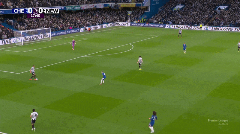 就在这一连贯换位的同时,维蒂尼亚的前插带走了恩佐-费尔南德斯,为登贝莱赢得充足的时间与空间,得以将球传给前插的埃梅里——佩德罗-内托全然没有意识到,自己需要切换防守目标,才给了对手机会。