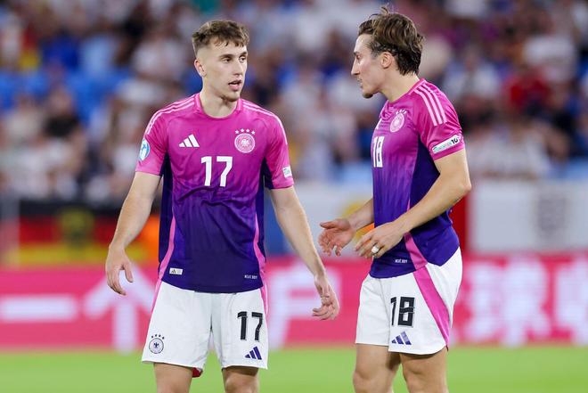 赖茨在一众德国国脚中奔跑,其中包括他未来在莱比锡的队友劳姆与亨里希斯。这张照片摄于2024年德国队欧洲杯备战期间,赖茨与未来的队友劳姆、亨里希斯同框。